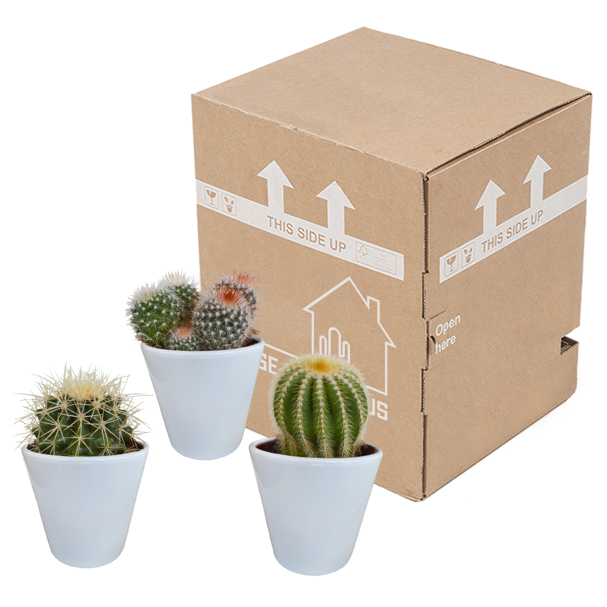 Bolcactus Mix 8,5 cm - Drie Sculpturale Bollen in Witte Potten