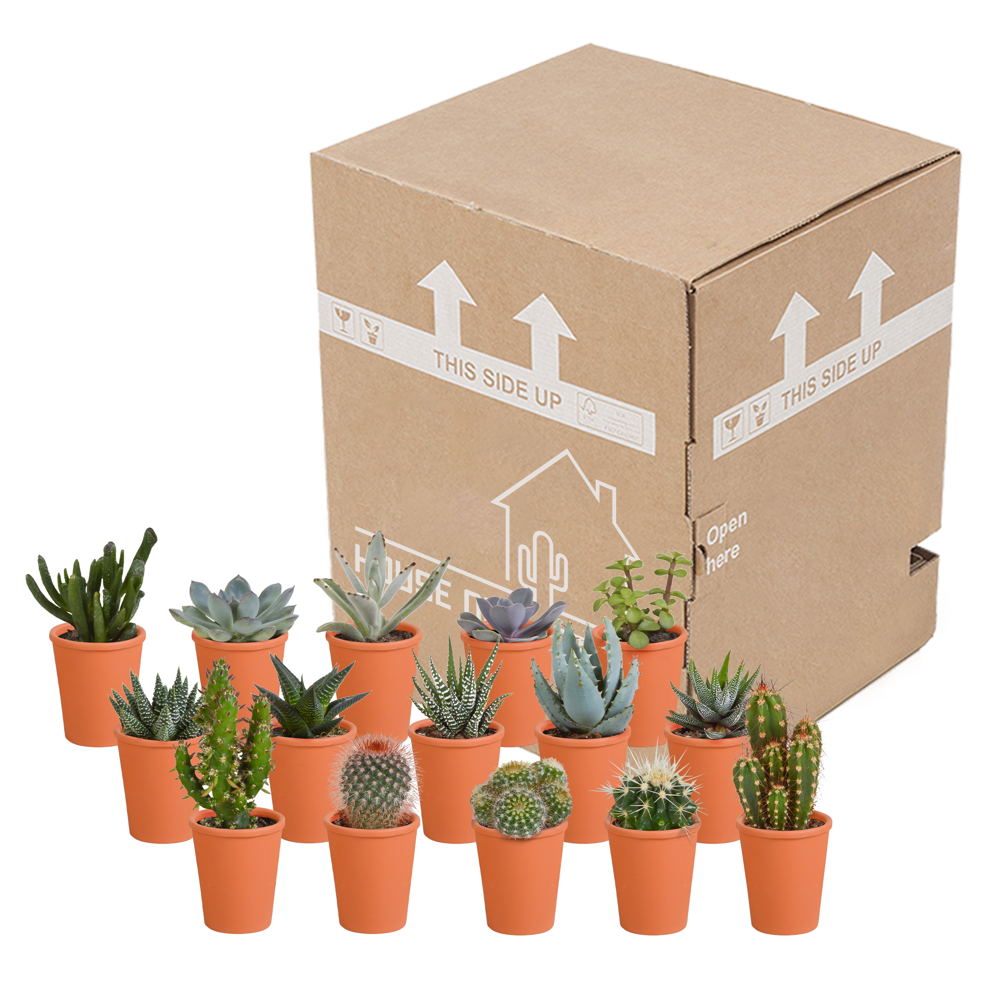 Wat een MEGA mix is dit! Deze spectaculaire mix bestaat uit maar liefst 15 cactussen en vetplanten die in kleur, hoogte én vorm van elkaar verschillen. Van een Cereus tot een Echeveria en van een Haworthia tot een Crassula - alles zit in deze mix. Alle planten komen rechtstreeks van de kweker en zijn dus van de hoogste kwaliteit, gepresenteerd in mediterrane terracotta potten.